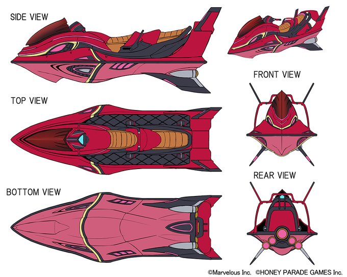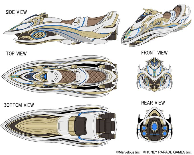 こちらも #ドルフィンウェーブ よりデザイン担当させて頂いたマシン「ティーヴァ」になります! 搭乗者のヴィーナさんとセレナのユニフォームがとにかくインパクトがあるのでそこに合うゴージャスなマシンをと考えた結果です🚤🚤🌊 #ドルウェブ ©Marvelous Inc. ©HONEY PARADE GAMES Inc.