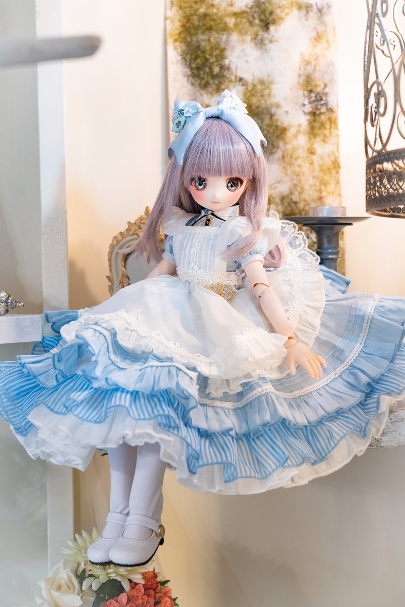 【ドルパ頒布物④】MDD/DDP/SDMサイズ 不思議の国のアリス ワンピース、アンダースカート、エプロン、カチューシャのセットです。 涼し気な薄い生地で制作しました。円形以上のボリュームがありますので座っても綺麗に広がります。 #ドルパ_ディーラー #ドルパ47
