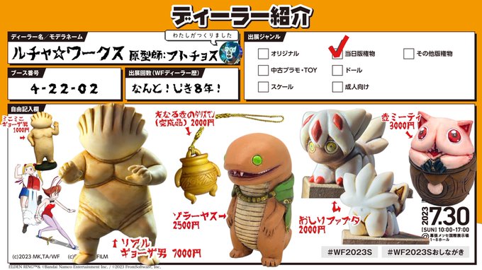 7/30の #WF2023S #WF2023Sおしながき です✨ #ドロヘドロ ・ミニミニギョーザ男 1000円 ・リアルギョーザ男 7000円 #ELDENRING ・友なる壺(完成品) 2000円 ・ゾラーヤス 2500円 #メイドインアビス ・おしりファプタ 2000円 ・壺ミーティ 3000円 ※友なる壺以外はガレージキットでの販売です。