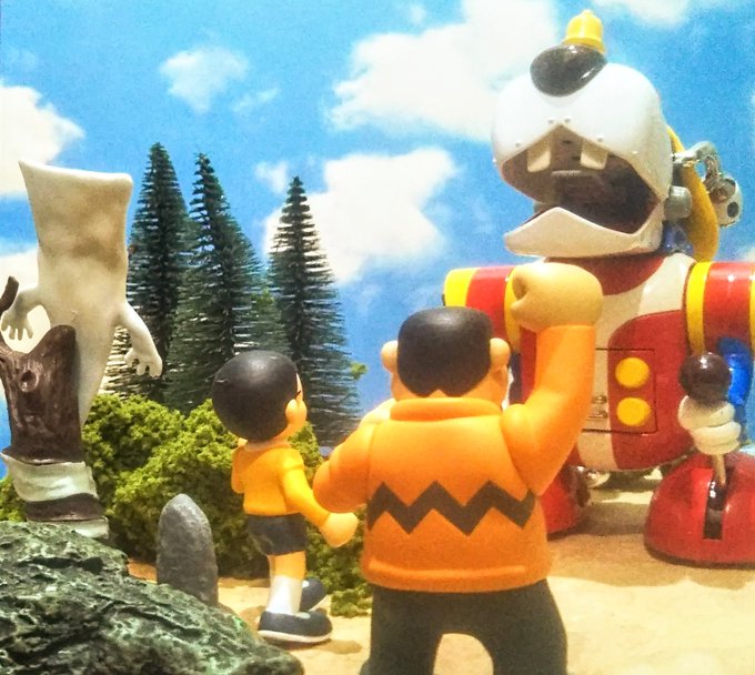 #夜のフィギュア撮影会 お題「3人組」(既出) ヤッターワン 「ワオ~ン!」 のび太 「出たよ!ヤッターワンだよ! や〜っておしまい!」 一反もめん、ジャイアン 「アラホラサッサ〜ッ!」 #ヤッターマン #ドロンボー一味