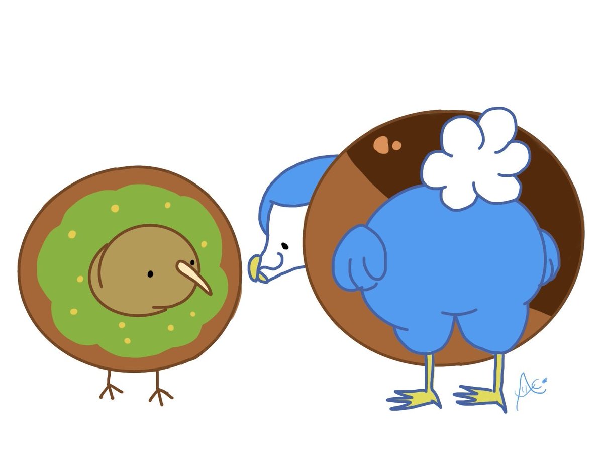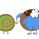 ドーナツには目がないキーウィとドードー🥝🦤 大きなドーナツは誰かに取られないように、頭を突っ込んでいくスタイル🍩 #キーウィ #ドードー #オリジナルイラスト #落書き #一日一絵 #Procreate #イラストレーター #デザフェス55