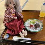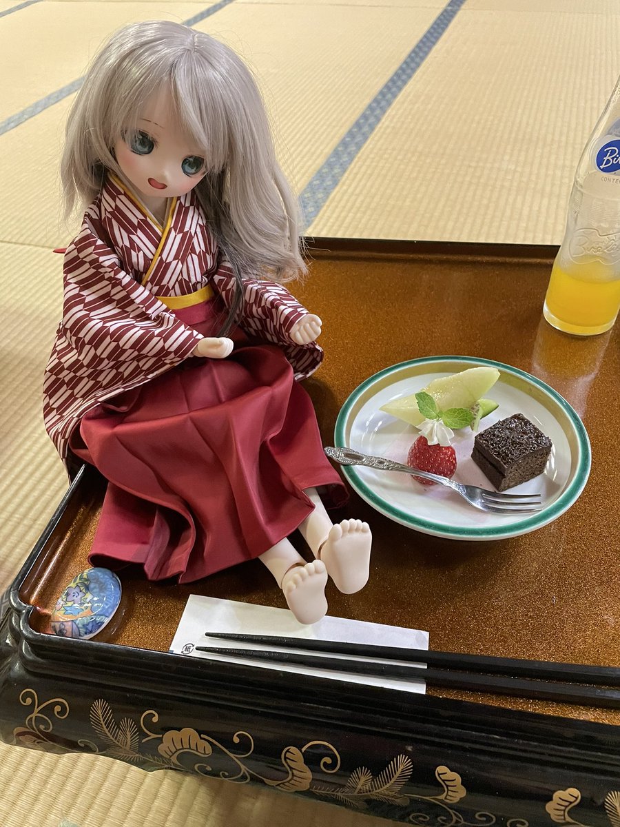 のあ「若女将、これはなんですか」 あい「これはメロンいちごとケーキ」 のあ「ざっくりしすぎ」 あい「早くおたべ」 #ドール #ドールオーナーさんと繋がりたい #MDDはいいぞ #ドーラーズトレイン #うちのこかわいい