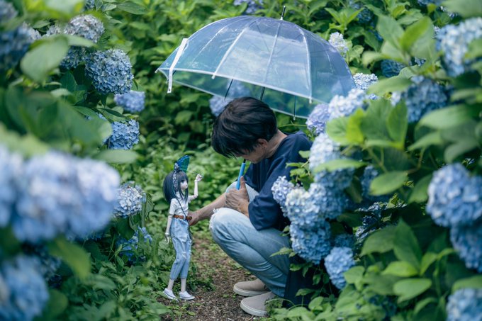 涼しげな写真を目指してたんですけどね…汗でずぶ濡れの初老男性を量産しました。梅雨なのに暑過ぎた玄白解体新書ポンポーンっ!🩻 脱水なりかけながら頑張ったんでここで供養させて下さい🙏🛎チーン #ドールとオーナー #ドールとセルフポートレート #紫陽花