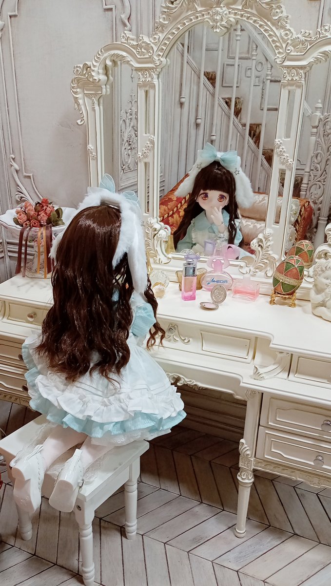 最高すぎるので見て欲しい…😭(みどりぴゃんにはちょっと大きめサイズ(1/3)の鏡台だったのだけど立て膝で解決する事によりママの鏡台にあこがれるようじょみが出て最高最高最高になってしまった) #ドールスタジオSEN #KUMAKOちゃん #木茶動物園