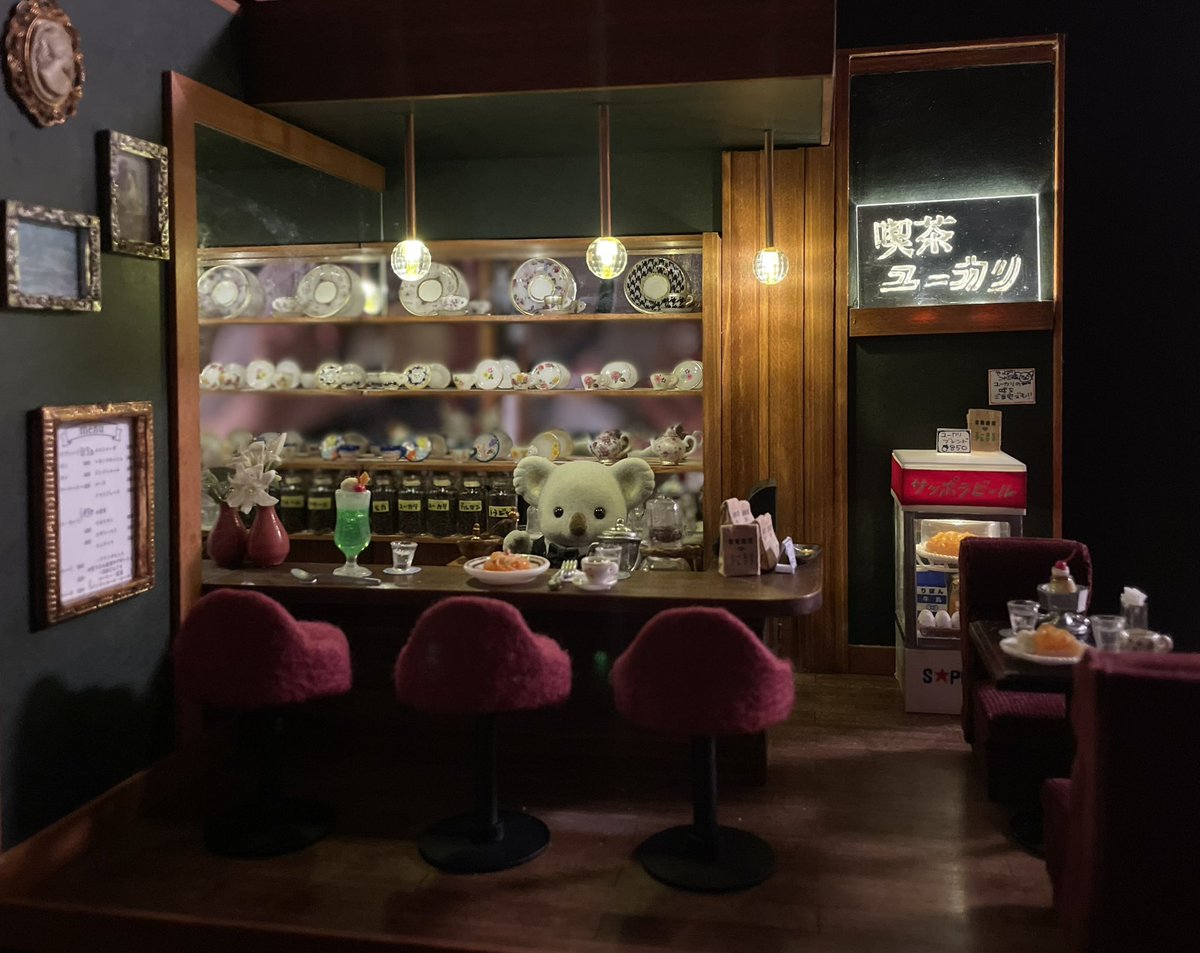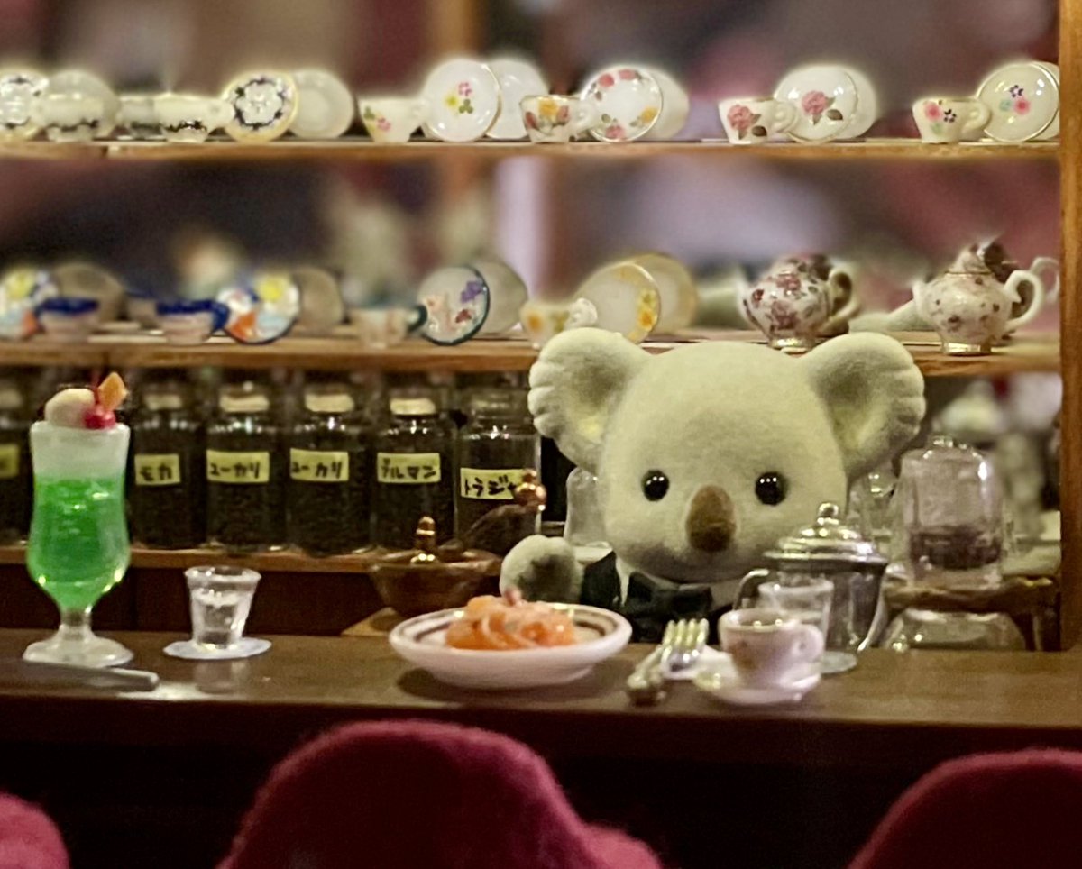 【コアラ店長の純喫茶🐨】 ついに完成しました😭✨お店の名前は喫茶ユーカリです。ミニチュアショウ(6階25番テーブル)でぜひ実物を見てください❤️ 🐨みんなまってるよー #シルバニアファミリー #ドールハウス