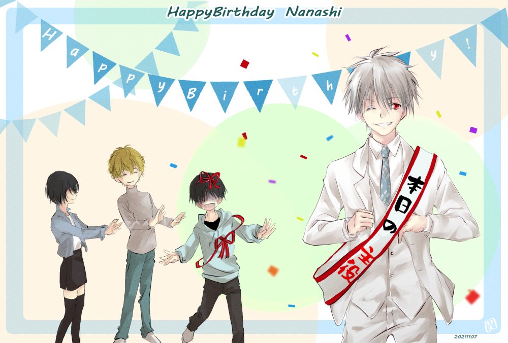 #ナくしたナにかのさがシかた 連載中最後の誕生日ということで(3人小さめですが)4人描かせていただきました。ナナシくんのお誕生日記念絵✨ ナナシに「ハルはもう俺のだから」って言われるかな、って思いながら描きました笑 HappyBirthday!