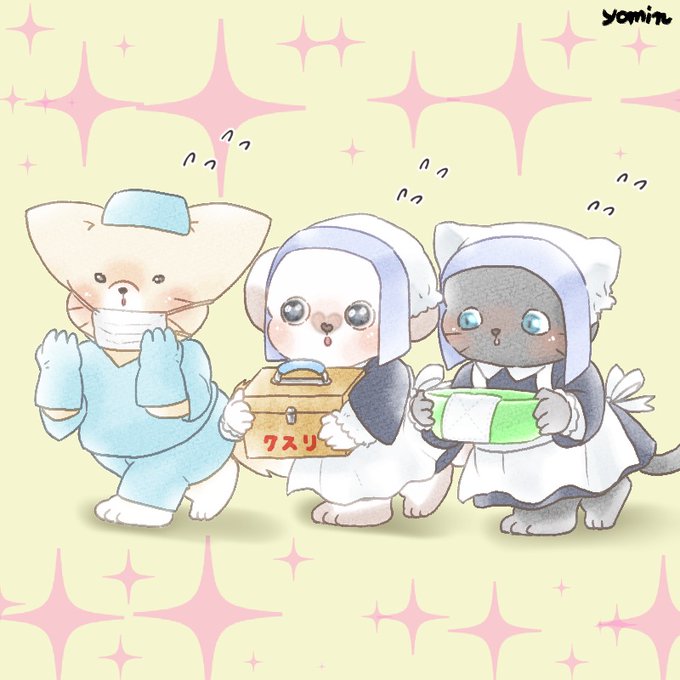 【ぷくりいぬ】5/12ナイチンゲールデー おはよー☀️ 今日はナイチンゲールデーということで、病院のお手伝いにきましたっ 🐶🐱✨看護師さんですっ 🦊💦じょ、助手ですっ ドキドキするけど、がんばろー✨ #イラスト #ナイチンゲールデー