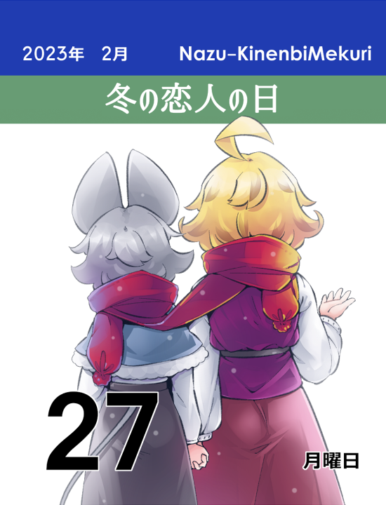 さーて、今月の担当日は 2/2 おんぶの日 2/8 郵便マークの日 2/14 バレンタインデー の3枚でした! 来月もまた見てくださいね!じゃんけんぽん👊 うふふふ… #ナズーリンの毎日記念日めくり