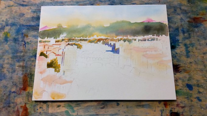 すでに若干後悔してる部分もありつつ進んでます。これは順光といって正面からの光なんですが、こういうテーマはとても難しい。終盤まで完成が見えないので忍耐の描き込み。でも明日一気に仕上げるよ😆👍今日はこれから仕事。 #透明水彩 #watercolor #ナチュラルワトソン