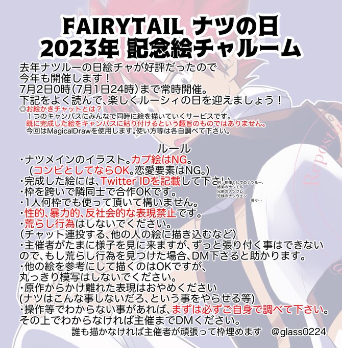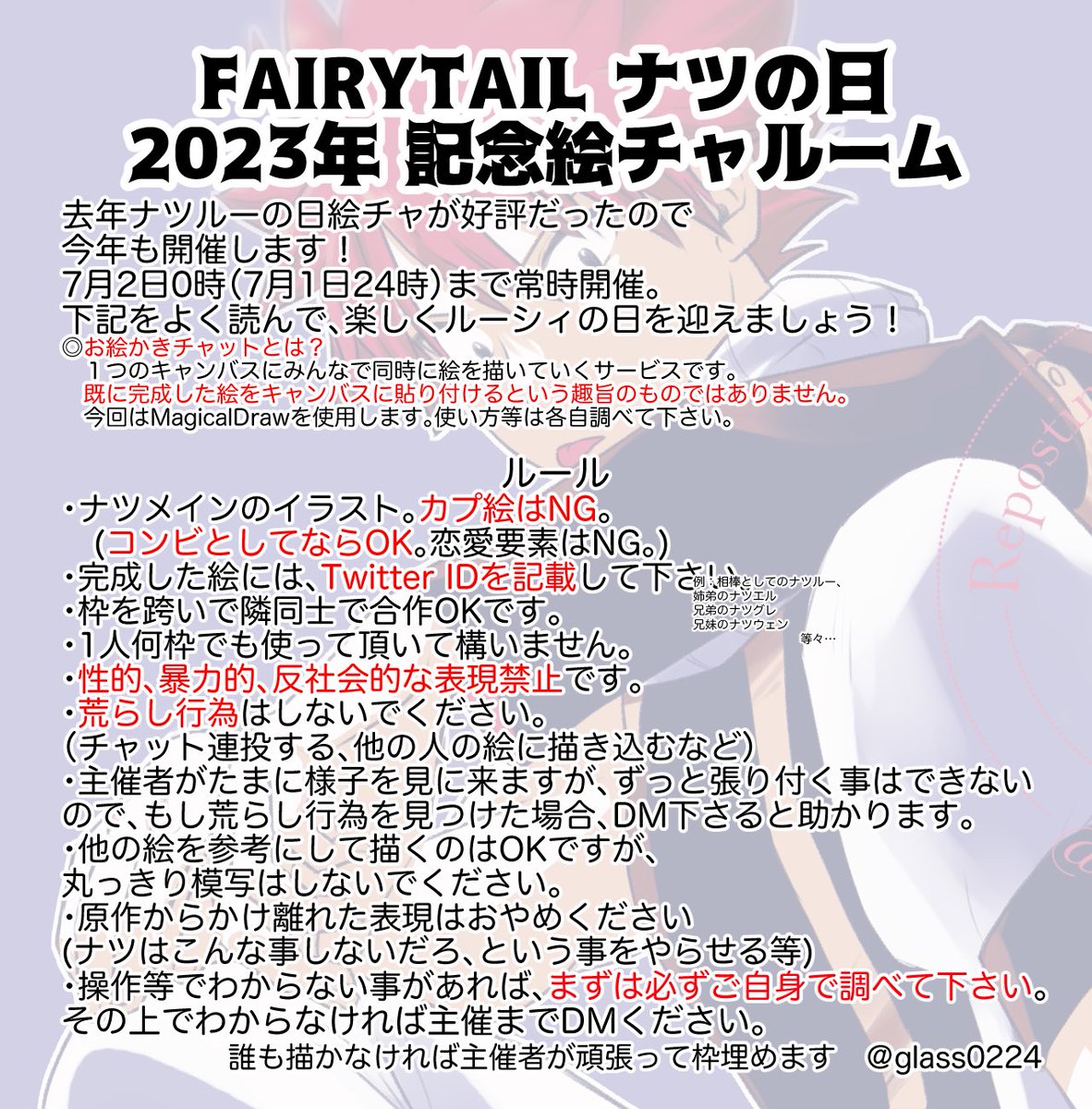 ナツの日記念絵チャ開催します! 私をフォローしててもしてなくても関係なく、どなたでも気軽にご参加ください! 7月2日0時まで常時開放していますので、どのタイミングで描いてもOKです! ルールをよく読んでくださいね! kuku.lu/p17d208ba #ナツの日