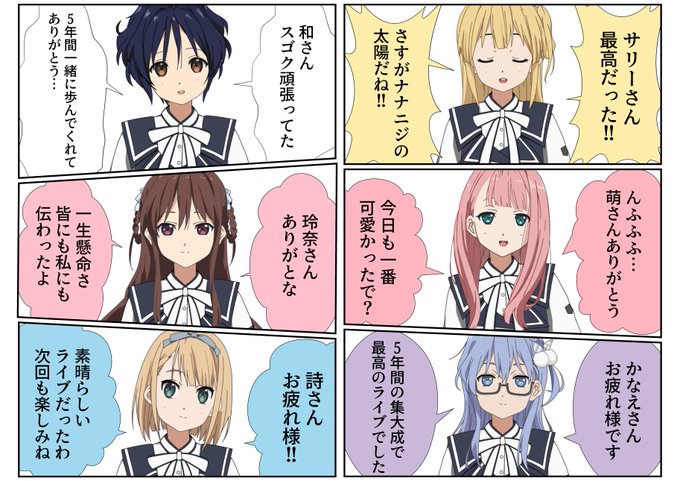 (続き) 朝起きて (やっぱり6人のお祝いイラストにしたい!) と思い直し #MUSICBLOOD のを再利用。 パッと見で読んで貰えるように キャラが言いそうなセリフに手直しして 作成したコレをお見せした。 驚きはされてました。 喜んでいただけてたら幸いです😊。 #ナナニジ #ナナニジデビュー5周年
