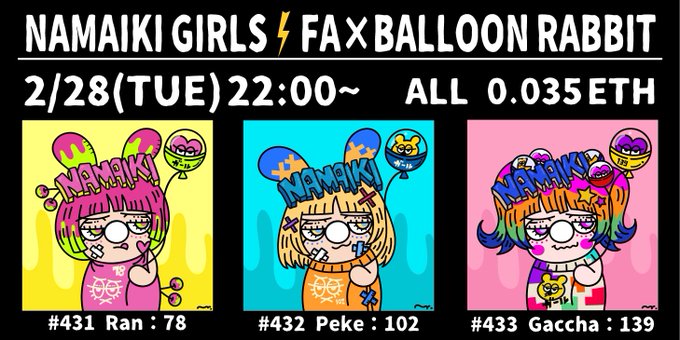 NAMAIKIGIRLS⚡️FA×BALLOON RABBIT🎈🐰第2弾💥 2/28 (火) 22:00 0.035 ETHで固定リストです⚡️⚡️ 🎁購入者特典として、NAMAIKI GIRLS MUSIC🎧♪のALがゲットできます👍🏻(希望者、重複不可) リンクはリプ欄に⬇️ ぜひチェックしてみてね #ナマイキちゃんは推されたい #ナマイキガールズファンアート