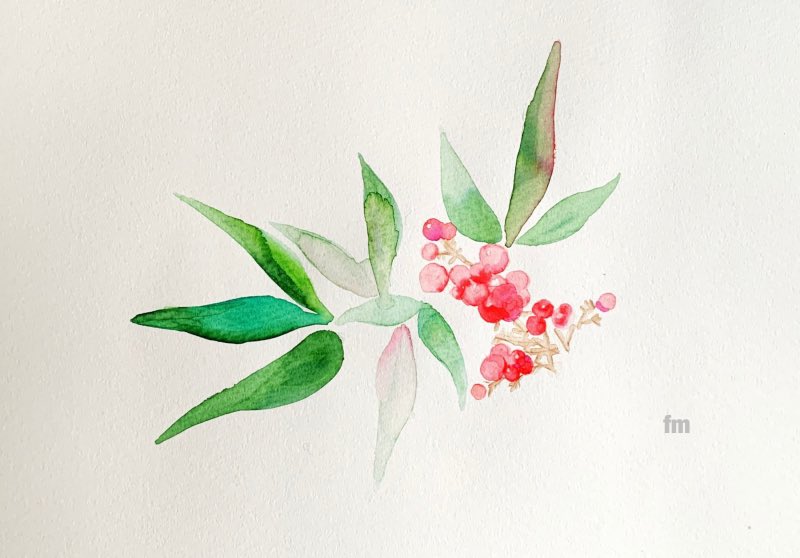 色味の少ないこの季節に惹かれるのは繊細な枝ぶりと赤い実の #ナンテン #heavenlybamboo #watercolor #watercolorpainting #illustration #水彩画 #水彩 #透明水彩 #イラスト #お絵描き #落書き #絵描きの輪 #絵描きさんと繋がりたい