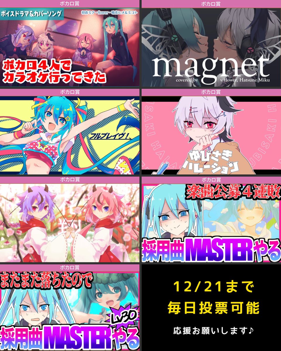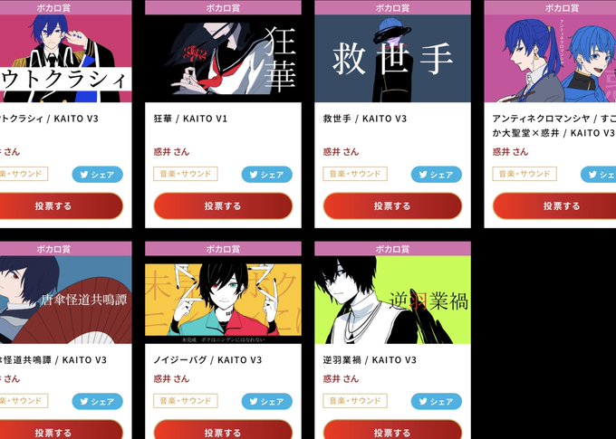 #ニコ動アワード2022 あらためて! 私の曲が7作品、最終投票にノミネートされているそうです〜!!! 本当にありがとうございます……!😭🙏 うちのKAITOさんを何卒よろしくお願いいたします🙌 投票先↓ site.nicovideo.jp/premiumaward/n…