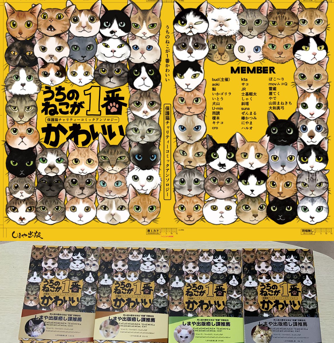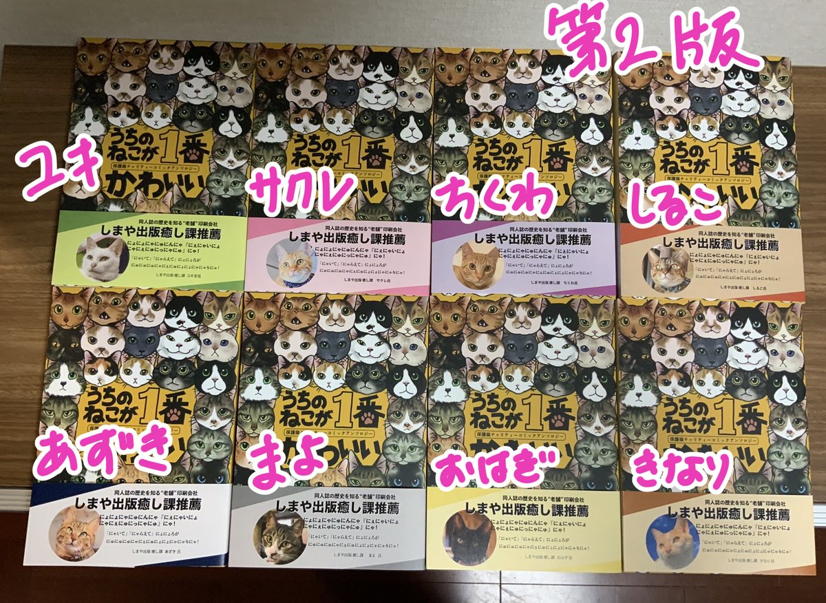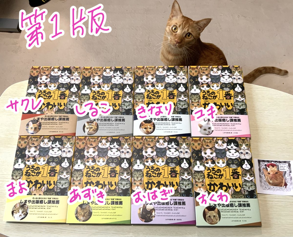 チャリティー猫アンソロの今ある在庫は通販用なので、 #ニャンズマーケット8 に向けて第3版を印刷しました😄🙌 猫ちゃんの推薦帯は第1版・第2版と同じく、しまや出版様が無料でつけてくださいました🙇 第3版は癒し課メンバー子猫時代バージョンですー! #ニャンズマーケット ふみふみブロック 71番 twitter.com/catAnthology/s…