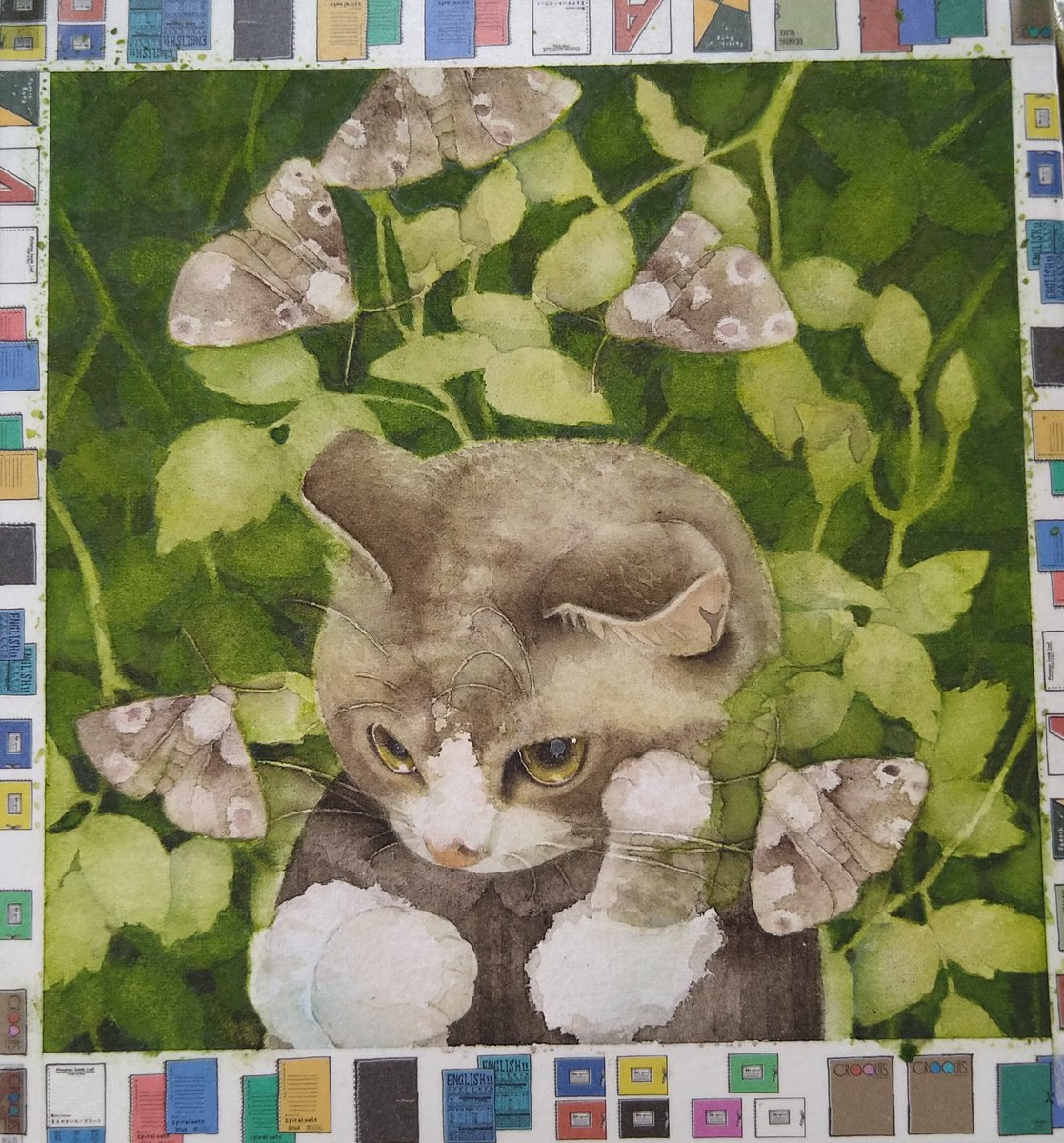 この作品はもうちょい描いたら完成です。ニャンズマーケットでお披露目します ★7月17日 にゃんともニャンズマーケット8 にくきゅうブロックの50にいます。原画販売をします。お支払いは現金のみです。遊びに来てね~。 #ニャンズマーケット #キジトラ猫 #水彩画