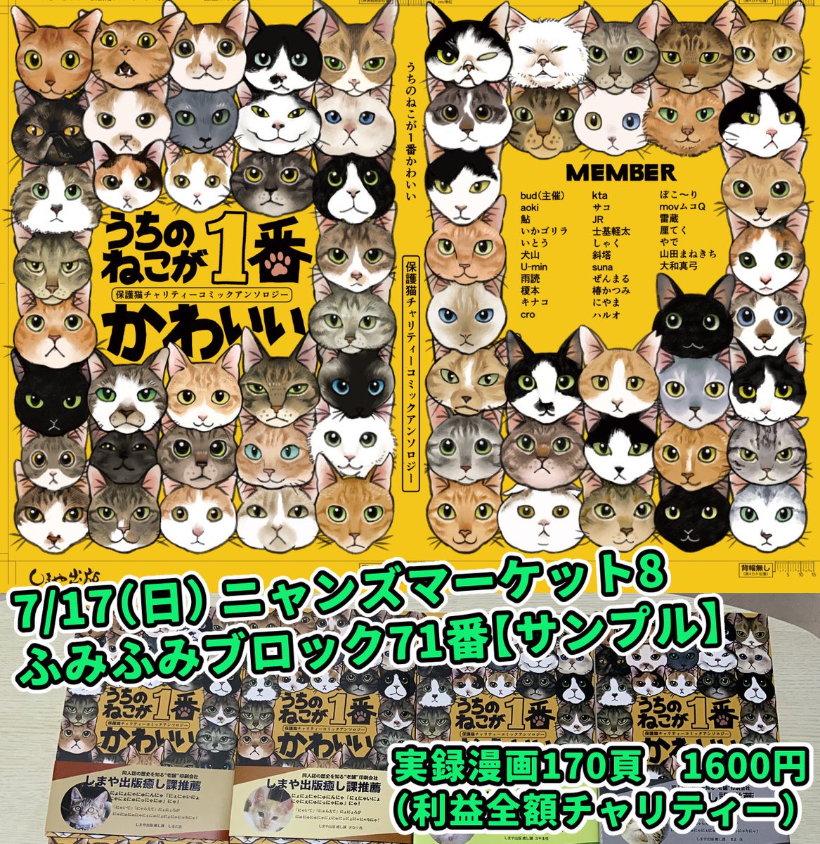 #ニャンズマーケット のスペース出ました🙌 【ふみふみブロック 71番】です! ①保護猫チャリティーコミックアンソロジー➡1600円 ②ディーン&サム写真集➡400円 ③カラーバリエーション猫ちゃんアクキー➡各500円 アンソロジーの純利益は全て保護団体に寄付されます 7月17日 京セラドーム🙇🐾 twitter.com/NyansMarket/st…
