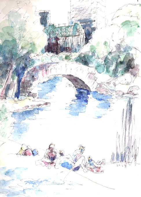 #りえこさん冒険の思い出 その747 ニューヨーク。美術館の後は、セントラルパークの水辺で高層ビルを望みながらのんびりというのもいい〜かな? #絵 #旅 #水彩画 #スケッチ #watercolor #ニューヨーク minne.com/ritakahashi4 rieko44.base.shop