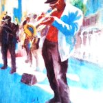 #りえこさん冒険の思い出 その747 ニューヨーク。悪名高き42丁目付近。ジャズやロックなどを演奏しているミュージシャンも多く、とても楽しいときも〜かな? #絵 #旅 #水彩画 #油絵 #スケッチ #watercolor #ニューヨーク minne.com/ritakahashi4 rieko44.base.shop
