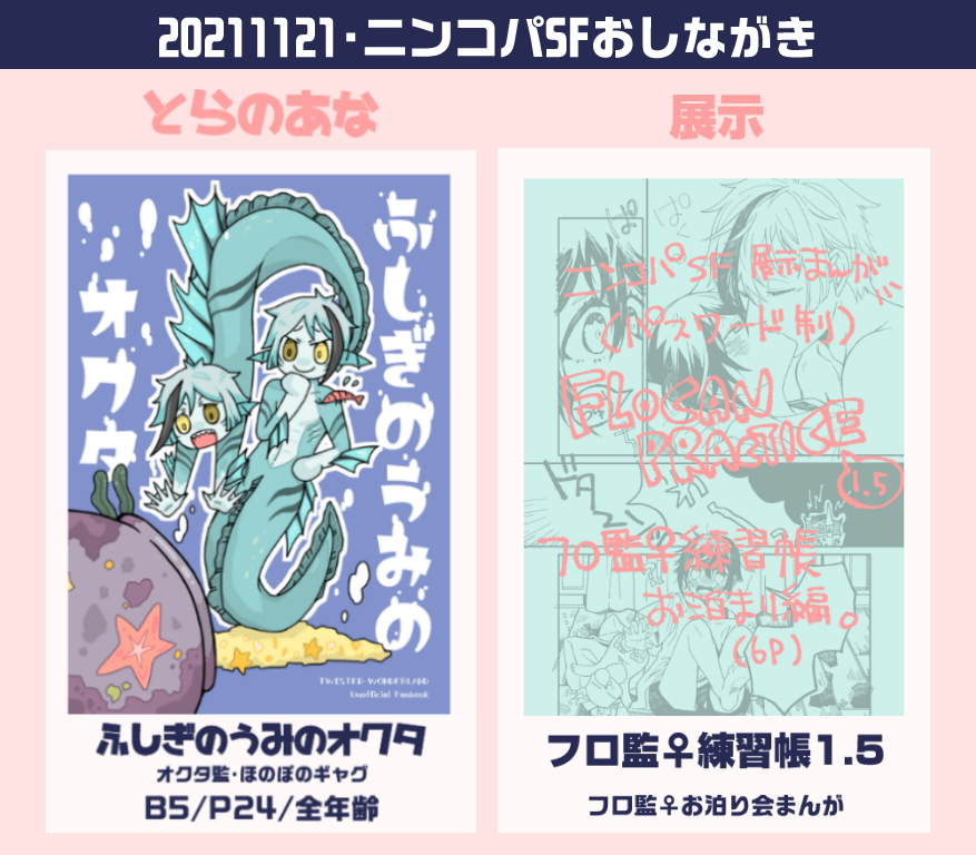 11/21のニンコパお品書きです。 SP→A あ4 星恋鳥 本は全てジェイ監♀小説になります。 新刊はとらのあな様にて12時通販開始予定です。 既刊はそれぞれ20:15、20:20よりbooth(倉庫発送対応)にて通販です。 展示は頑張れたら何かアップしたいなと考えております。 #ニンコパSF #ニンコパSFお品書き