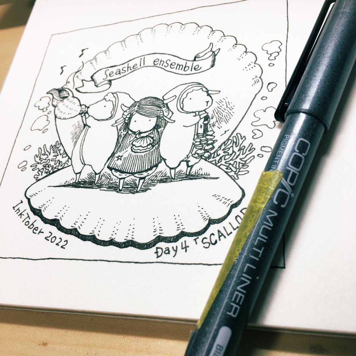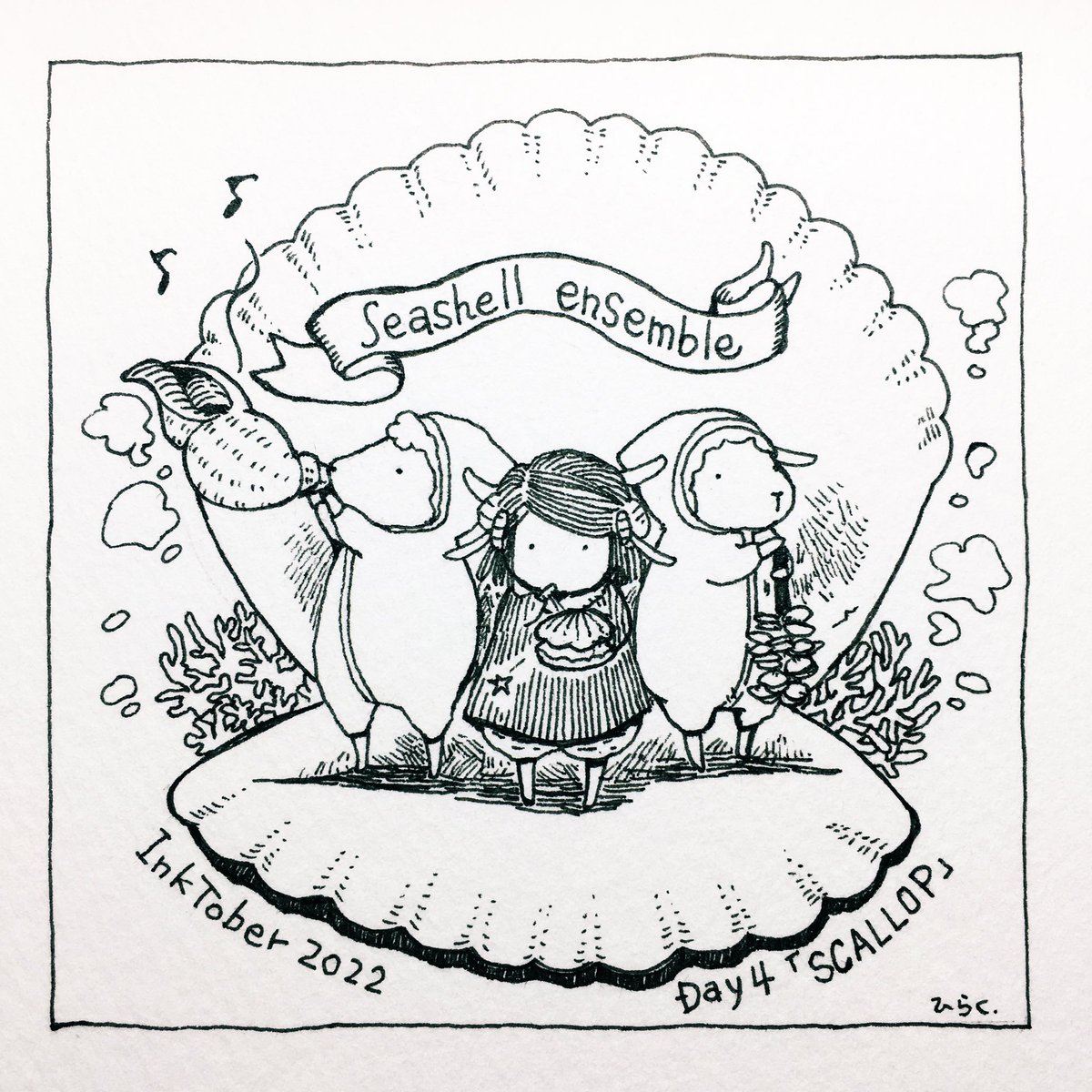 10/4: SCALLOP 奏でよう!ご機嫌な音楽を!! Let's play! Happy music!! #inktober2022 #inktober2022day4 #Pavot #ヌッフ #ペン画