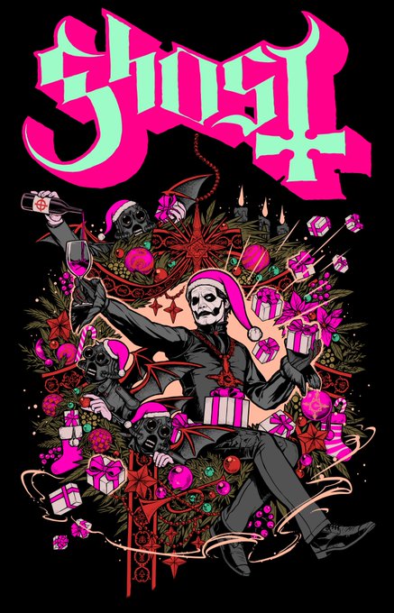 GHOSTのホリデイTのデザインを描かせて頂きました!今回はグールズも一緒で楽しい絵になりました!左上のワインを注いでるアイデアはアートディレクターの方からもらったのですが繋がりが出て良かったなあと思います!#ネイムレスグールズ #GHOST #イラスト shop.ghost-official.com/collections/ap… twitter.com/__yukke000___/…