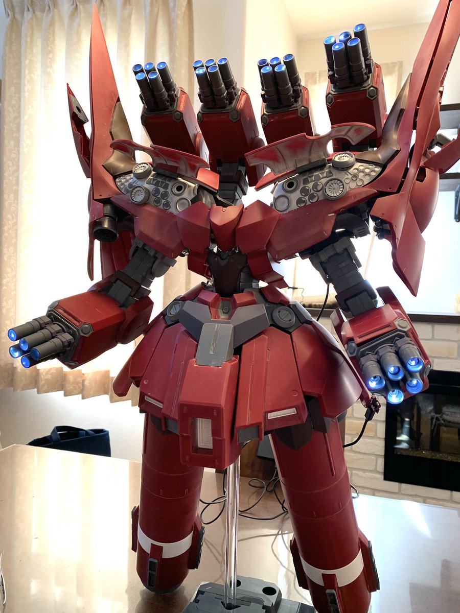 『HGUCネオジオング』塗装完了。赤と白のパーツのみ塗装。シナンジュも同様。あと両腕の手の部分だけ可動が出来るように改修しました。 #ガンプラ #ガンプラの画像を貼るとRTされると聞いて #ガンプラ好きな人と繋がりたい #ネオジオング