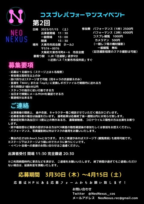 #ネオネクステージ第2回 応募開始しております! 応募は4/15までです! 期間短いので忘れる前のご応募お願い致します🙇🏻♀️ 下記リンクの受付フォームからお願い致します。 neonexusrec.wixsite.com/cosplay/%E9%96…