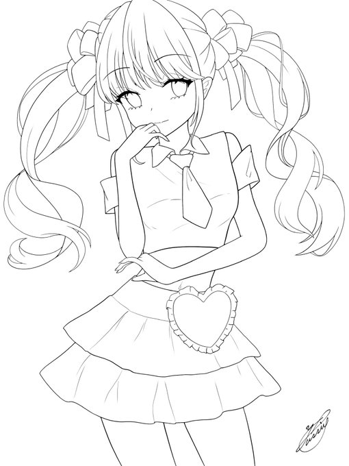 ぬり絵です ご自由に色を塗ってください(*ᴗˬᴗ)⁾ ↓↓↓ ibispaint.com/art/620762122/ #ibispaint #イラスト好きさんとつながりたい #ティアードスカート #オフショルダー #ツインテール #ネクタイ #線画 #ぬり絵