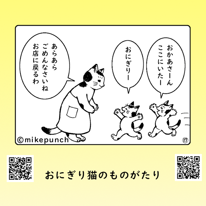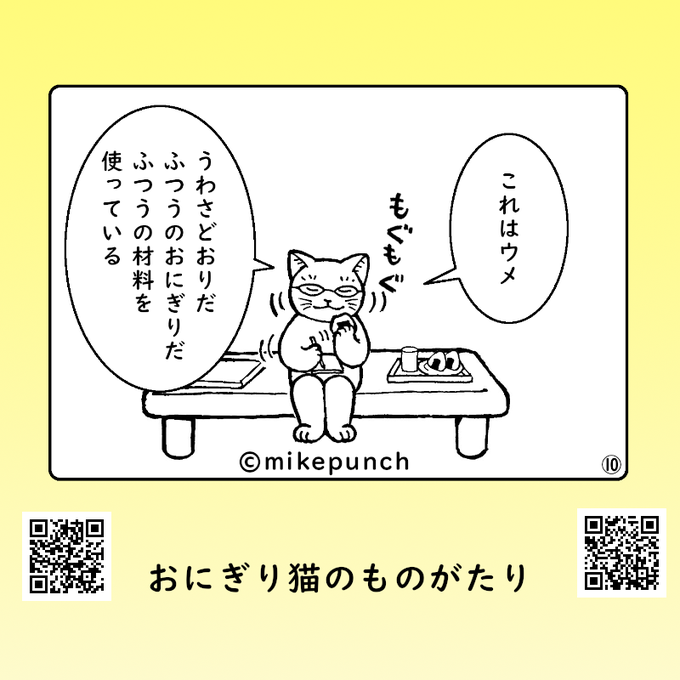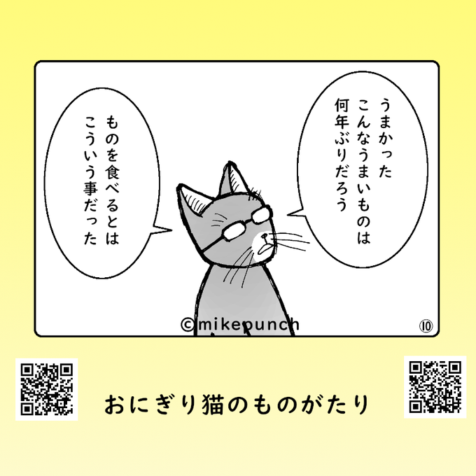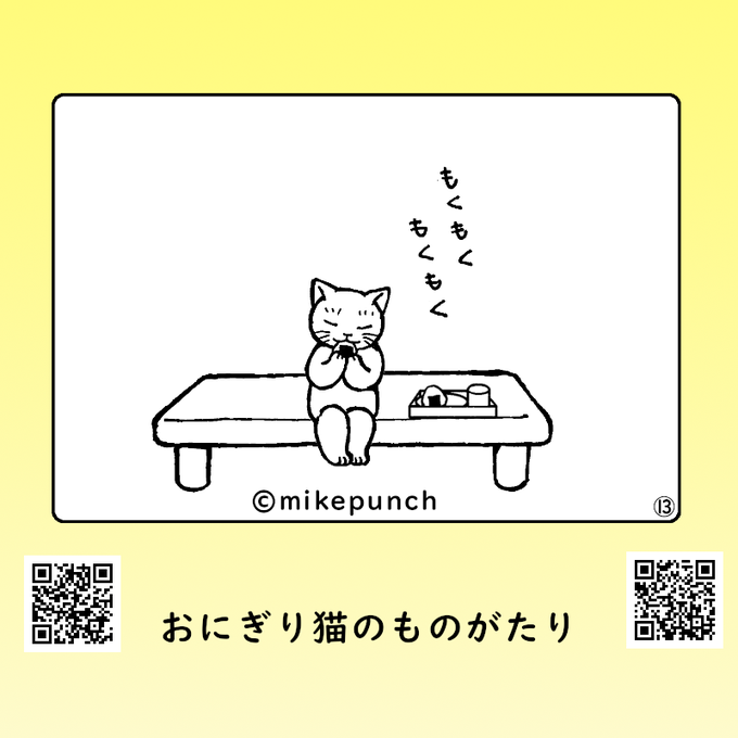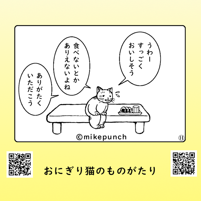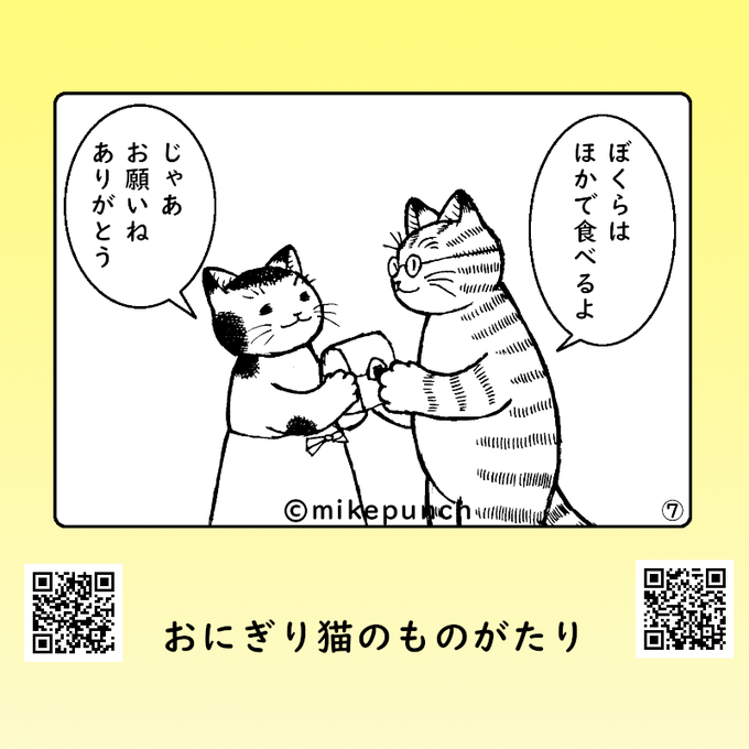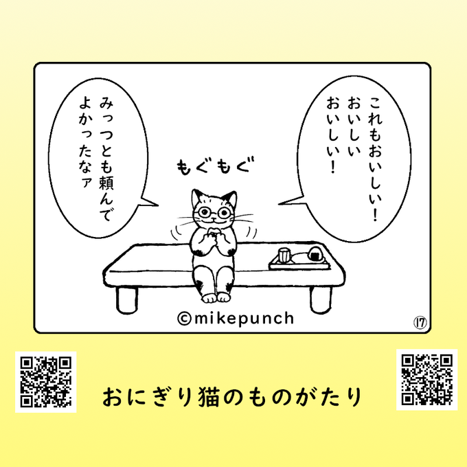 こんにちは。 お昼になりました。 午前中よく頑張りましたね✨ ゆっくりランチを致しましょう。 午後も大丈夫です 「おにぎり猫のものがたり」第一巻 #ネクパブPOFアワード 最終審査中 3/20まで無料でお読み頂けます。 画像の左QRコードもしくは固定ツイートから。 #漫画が読めるハッシュタグ twitter.com/NextPublishi…