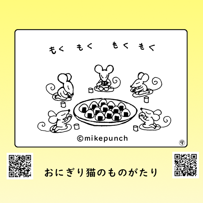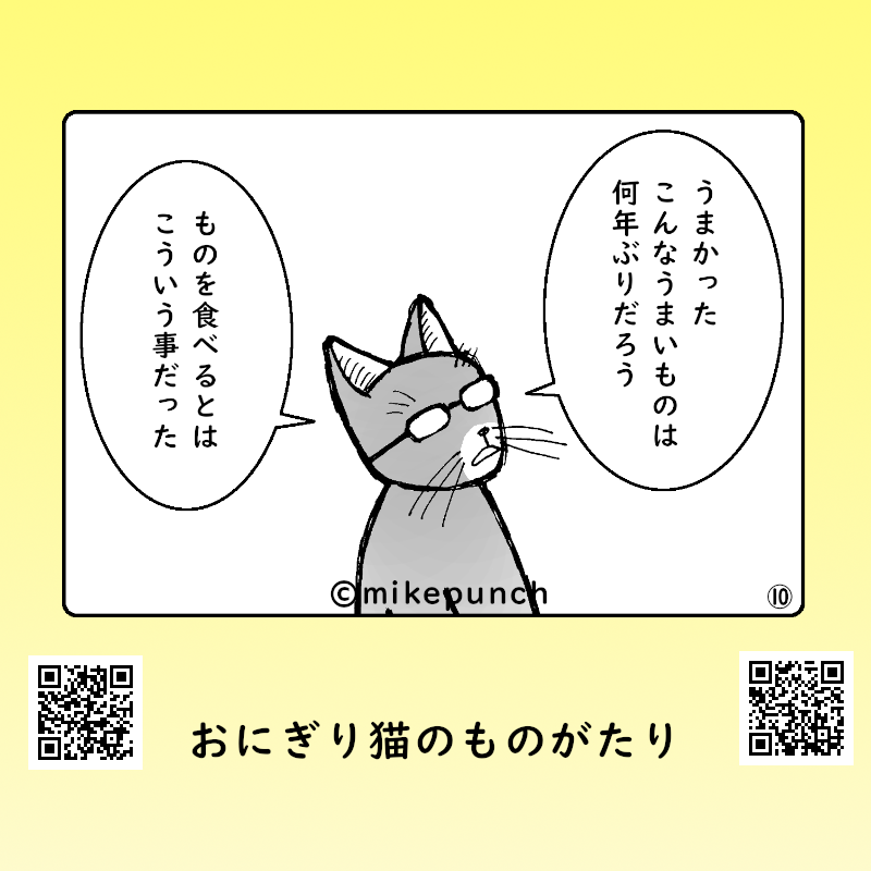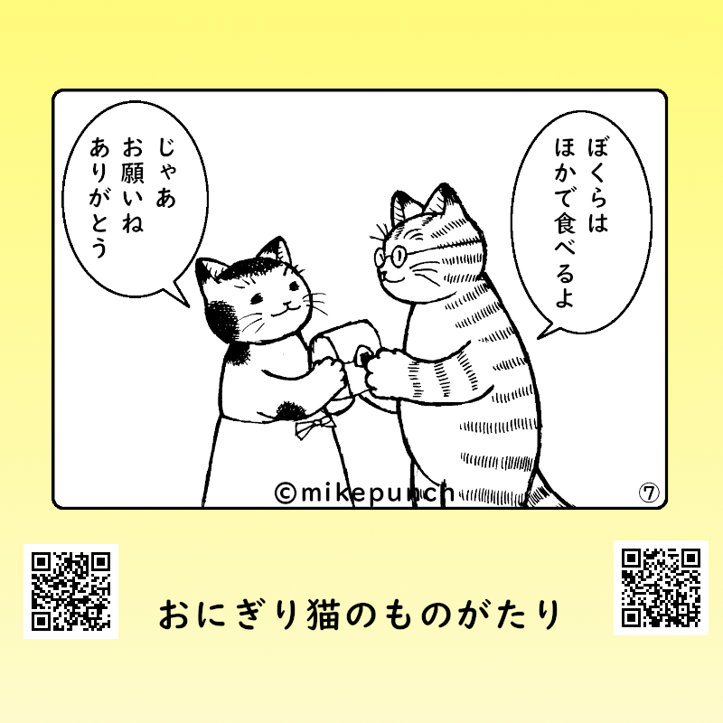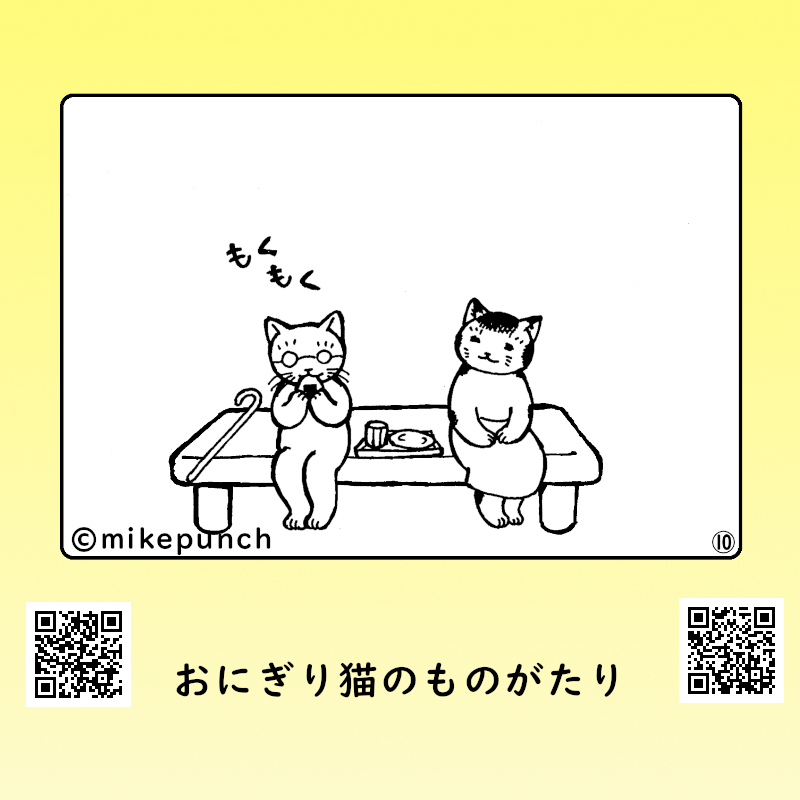 こんにちは。 お昼になりました。 午前中よく頑張りましたね! ゆっくりランチを致しましょう。 午後も大丈夫です 「おにぎり猫のものがたり」第一巻 #ネクパブPOFアワード 最終審査中 3/20まで無料でお読み頂けます。 画像の左QRコードもしくは固定ツイートから。 #漫画が読めるハッシュタグ