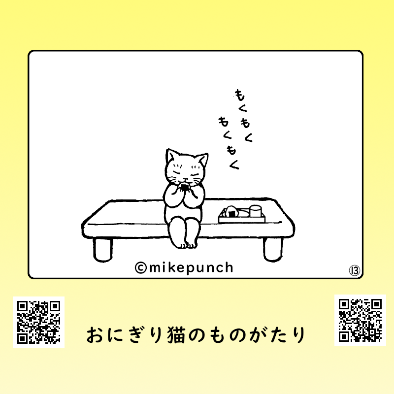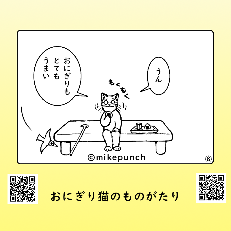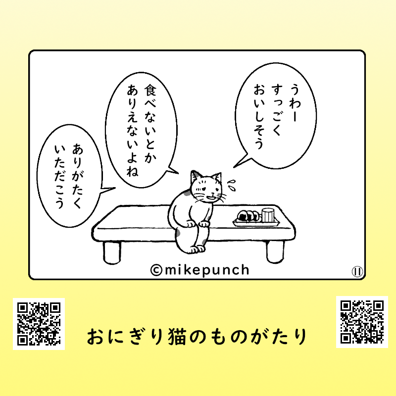 こんにちは。 お昼になりました。 午前中よく頑張りましたね! ゆっくりランチを致しましょう。 午後も大丈夫です🍙 「おにぎり猫のものがたり」第一巻 #ネクパブPOFアワード 最終審査中 3/20まで無料でお読み頂けます。 画像の左QRコードもしくは固定ツイートにて。 #漫画が読めるハッシュタグ