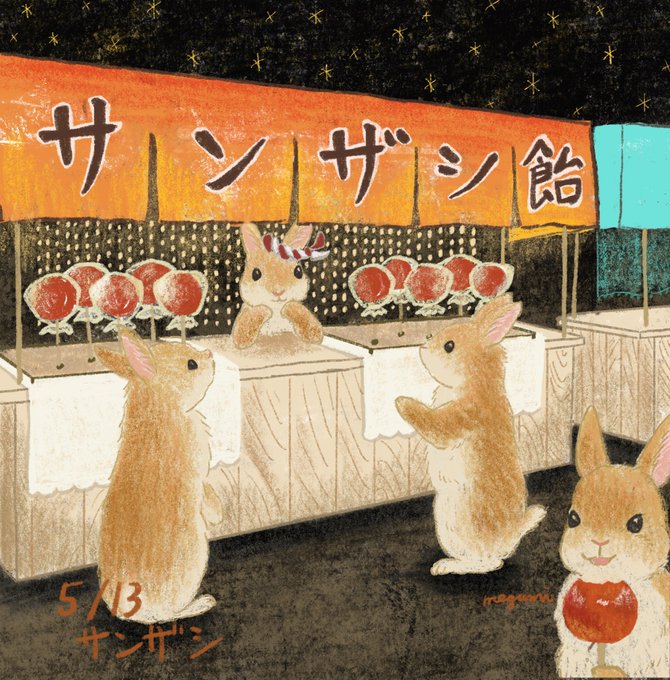 5月13日の誕生花はサンザシです。花言葉は希望 中国ではサンザシの実に飴かけたお菓子があるとか。通常串に複数個指した形が一般的みたいですがウサギならジャストサイズ🐰 #絵本 #挿絵 #イラストレーション #一日一絵 #ネザーランドドワーフ #うさぎイラスト #イラスト #イラストレーター