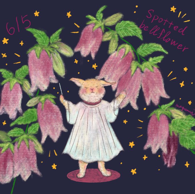 6月5日の誕生花はホタルブクロです。花言葉は愛らしさ。ホタルブクロ揺らしたらハンドベルみたいにいい音しそうで可愛いです🎵 #絵本 #挿絵 #イラストレーター #イラストレーション #イラスト好きな人と繋がりたい #一日一絵 #illustration #ネザーランドドワーフ #うさぎイラスト #動物イラスト