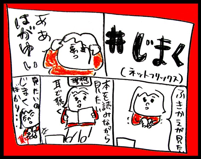 【ネットフリックス:字幕) ああ、はがゆい。吹き替えで見たい!!! 理想・・・本を読みながら、耳で聴いて・見る。 見たい番組、字幕ばかり。 吹き替え増えないかな?? #ネトフリ #Netflix #漫画が読めるハッシュタグ #映画好きと繋がりたい