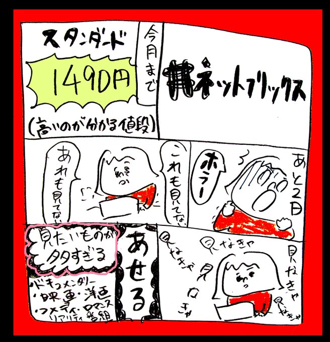 【ネットフリックス】 あと2日・・・見なきゃ。見なきゃ。見なきゃ。 『これも見てない。あれも見てない』 見たい!見たい!見たい!焦る。 Netflixは、見たいコンテンツが多すぎる。 #ネトフリ #Netflix #漫画が読めるハッシュタグ #コミックエッセイ #映画好きと繋がりたい