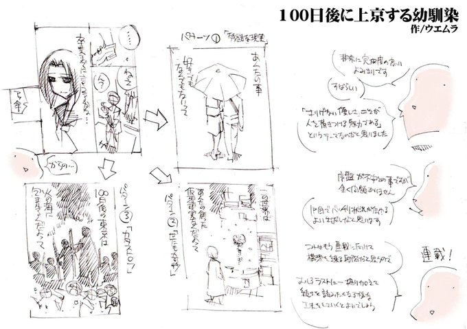 【住職のネーム直し第14回】「100日後に上京する幼馴染」非常に完成度の高い読み切りです。会話劇なのに飽きさせない手腕は見事の一言。直す所は特に無いのですが、連載に向けて続きが気になる感じのオチを3パターン用意しました。 debut.shonenmagazine.com/comic/14830 #ネーム寺 #漫画家志望さんと繋がりたい