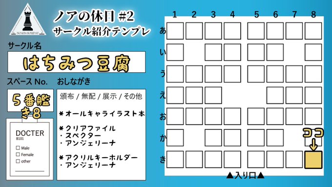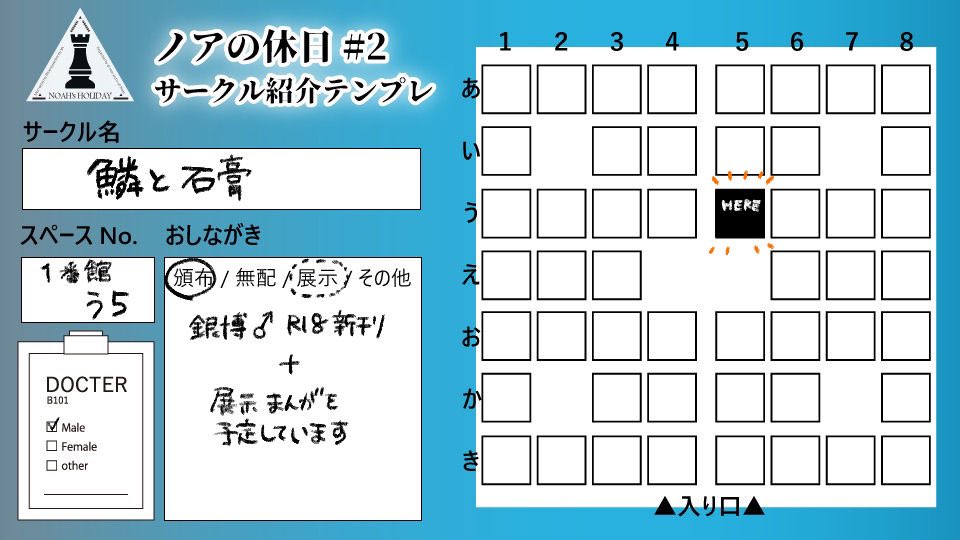 #ノア休2_サークル告知 ◆2番艦 う2 【あざらし教会】 2/23開催の「ノアの休日#2」に葬博(男性ドクター)で出店します。 既刊と展示のみ予定ですが宜しくお願いします。 (時期が近くなったらおそらくまた投げ直します)