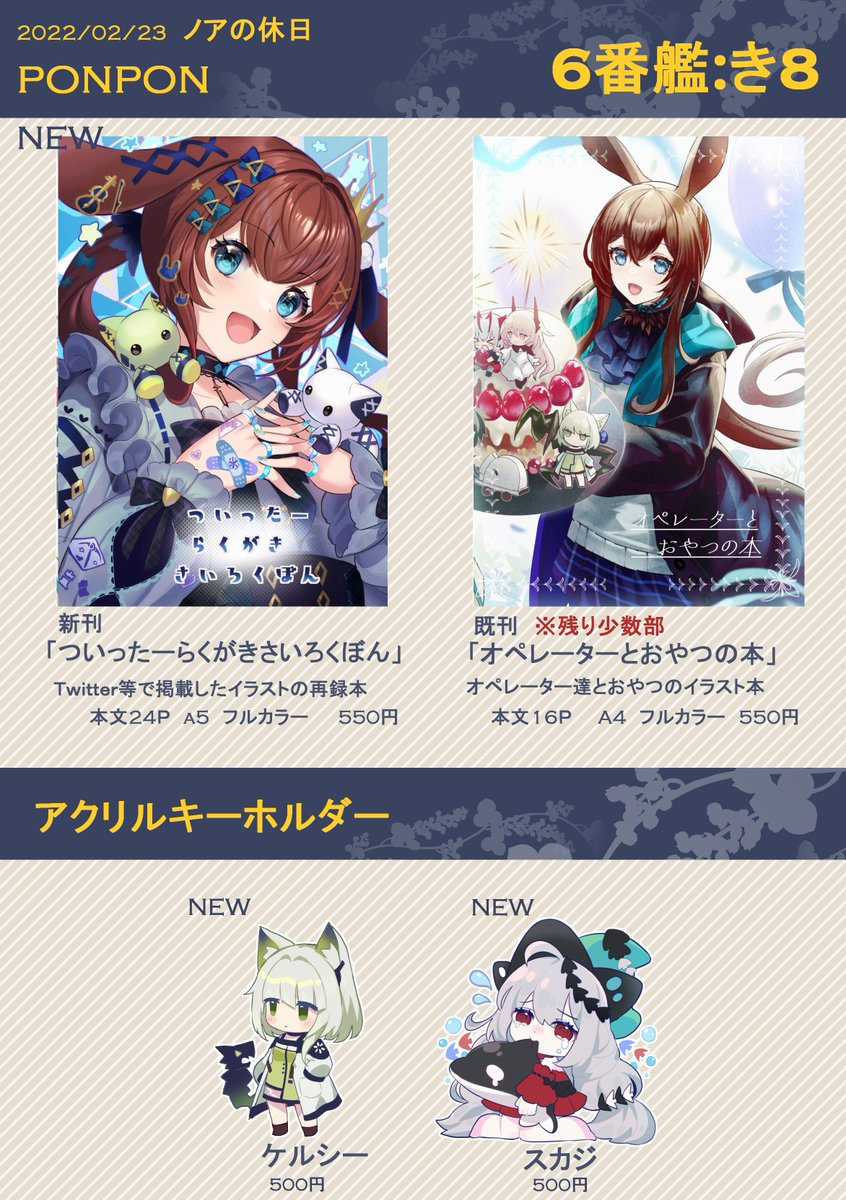 2/23(水)ノアの休日#2 スペース: 6番艦き8お品書きです。 新刊のイラスト本とスカジとケルジーのアクキーを予定してます。 アクキーはこちらの都合で送るのがちょっと遅くなります。webオンリー初めてですので何卒よろしくお願いいたします #ノア休2_サークル告知