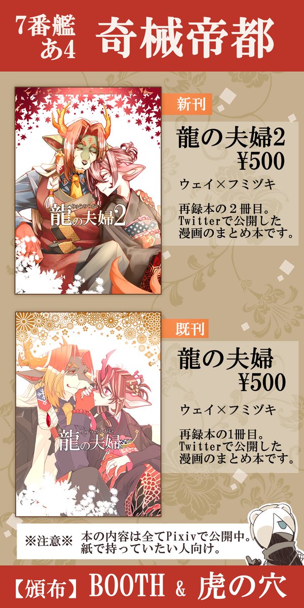 2/23(水・祝)開催の【ノアの休日2】のお品書きです。 サークル:奇械帝都 スぺ―ズ:7番艦あ4 新刊・既刊ともにウェイ×フミヅキのTwitter漫画まとめ本です。頒布はBOOTHと虎の穴で行います。詳しくはツリーをご覧ください。 #ノア休2_サークル告知
