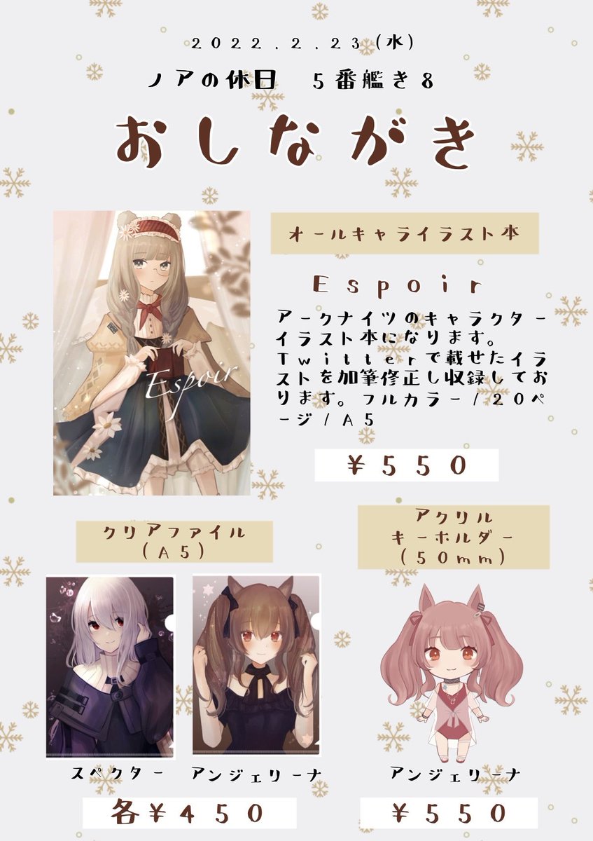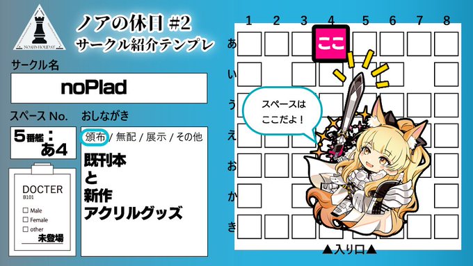 2/23(水)開催のノアの休日#2に参加します! スペース:5番艦き8 イラスト本、クリアファイル、アクキーを出します。 改めて、初の同人イベント参加ですが 何卒よろしくお願いいたします🙇♀️ #ノア休2_サークル告知