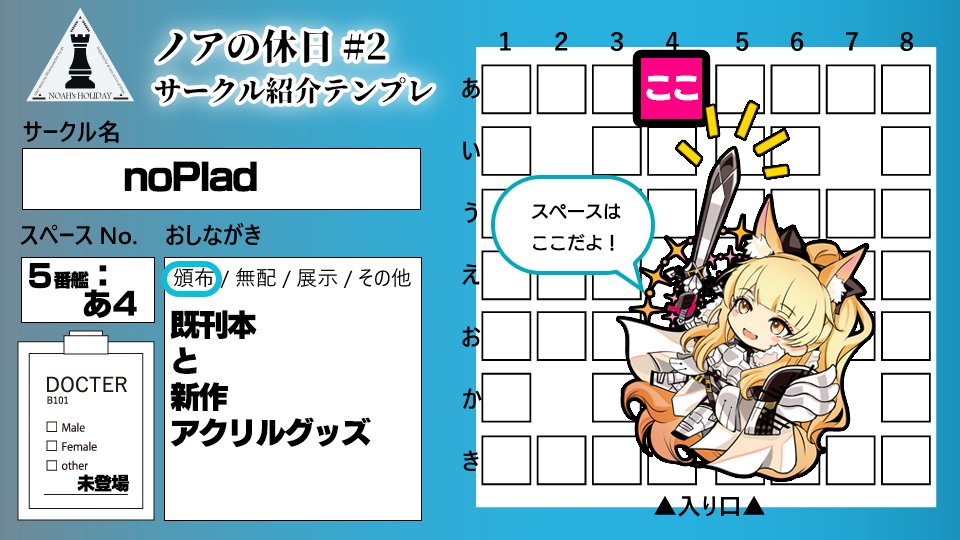 #ノア休2_サークル告知 pictSQUAREにて開催されるアークナイツオンリーWebイベント「ノアの休日」に出展します! 日付|2月23(水)11:00~24:00 スペース|5番艦 お-5 よろしくお願いします✨