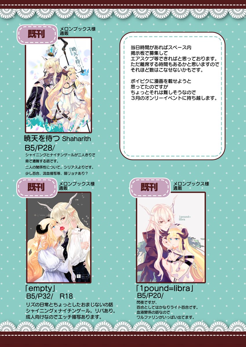 23日(水)ノアの休日#2の新刊サンプルです。 とはいってもまだ終わってないので(…)当日は先行予約受付する形になります。 当日は1話目を展示するので見て下さると嬉しいです~宜しくお願いします~~!! #ノア休2_サークル告知