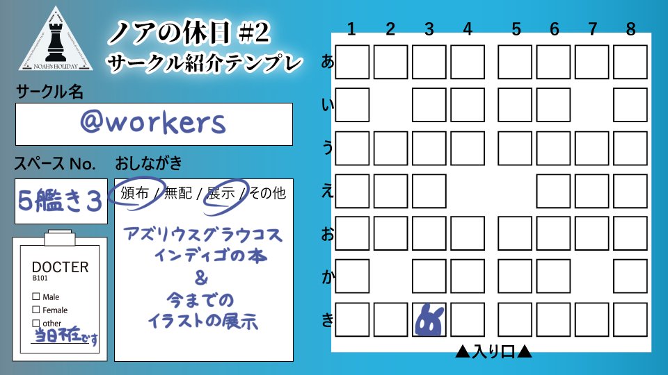 2/23(水・祝)ノアの休日【6番艦お2】 サークル「みずいろ天国」 リアルまだ休んじゃだめですよ状態になっており新作がご用意できませんでした🙇本当に申し訳ない エアスケブ企画はやりますのでよかったらご参加下さい ※サークル主休日出勤のため18時ごろまで不在 #ノア休2_サークル告知