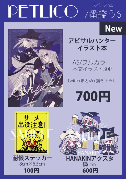 2023/3/25 「ノアの休日3」お品書きになります PETLICO/7番艦う6 新刊&新グッズはアビサルハンターイラスト本、サメステッカー、HANAKINアクスタです。既刊も少数あり。全てboothでの頒布になります🥳 よろしくお願いします~!! #ノア休3_サークル告知 #ノアの休日 #ノア休3