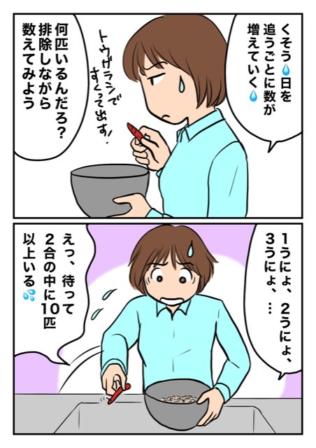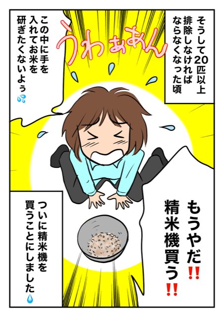 うにょ虫(=ノシメマダラメイガの幼虫)が発生して、米びつの中に入れてた唐辛子で掬い出す毎日… しかし、あまりにも増えすぎて それにも限界!(TдT) 精米機を買うことに! #玄米 #ノシメマダラメイガ #イラスト #イラスト好きさんと繋がりたい #日常マンガ twitter.com/5oF2NEoL38rq…