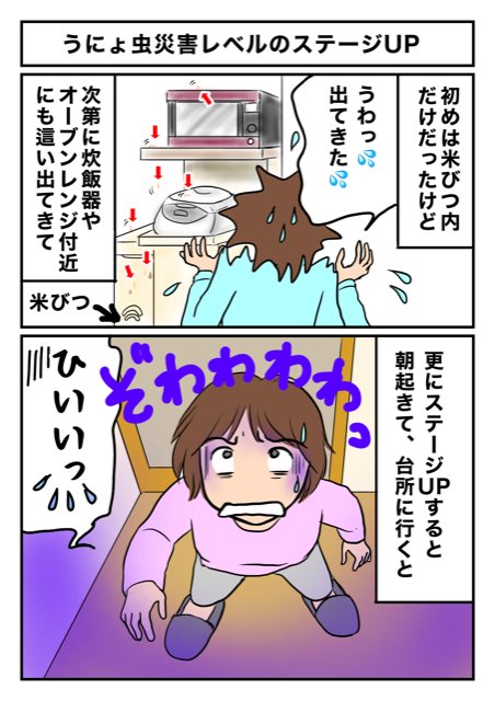 うにょ虫(ノシメマダラメイガの幼虫)被害ほ続きます…(汗) もうね、日に日にわが家(主に台所)がホラーハウスになっていくのよ…( ;∀;) #ノシメマダラメイガ #玄米生活 #ホラーハウス #イラスト #イラスト好きな人と繋がりたい #日常マンガ ↓前回はこちら twitter.com/5oF2NEoL38rqdV…