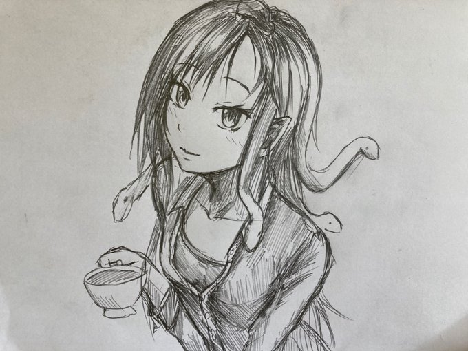 昼休みの落書き。 久しぶりにアオダイショウちゃんを描きました。 元魔王軍幹部でメデューサの眷族。 今は地球で元勇者のミミコの恋を電柱影から見守るだけが唯一の楽しみ。最近ファッションにこだわっとる(●´ω`●) #ノジャリミミコの生態