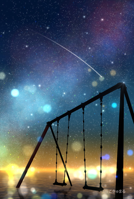 夕暮れの星空とブランコ。 #イラスト #ファンタジー #ノスタルジー #星空 #星景 #キリトリセカイ #キリトリ世界 #デジタルアート #illustration #digitalart #photograghy