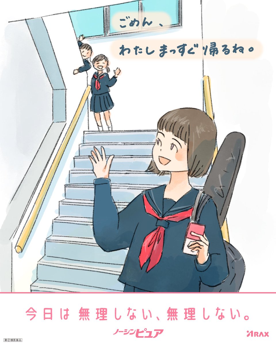 生理痛・頭痛の鎮痛薬「ノーシンピュア」のPRイラストを担当しました 生理の日は身支度完璧じゃなくていいよね、という高校生の絵です 私自身生理が重いので、無理をしない・させない認識が広まって欲しいと思います arax.co.jp/norshinpure/ca… #無理しない日描いてみた #ノーシンピュア #タイアップ